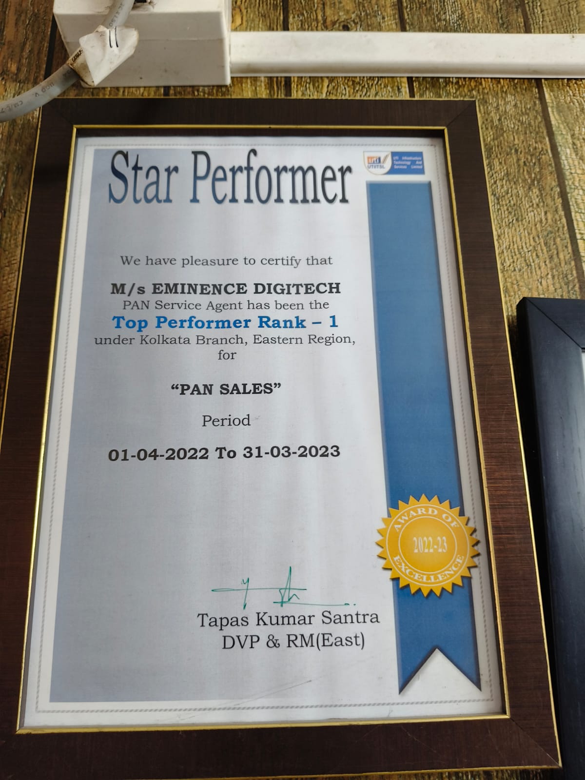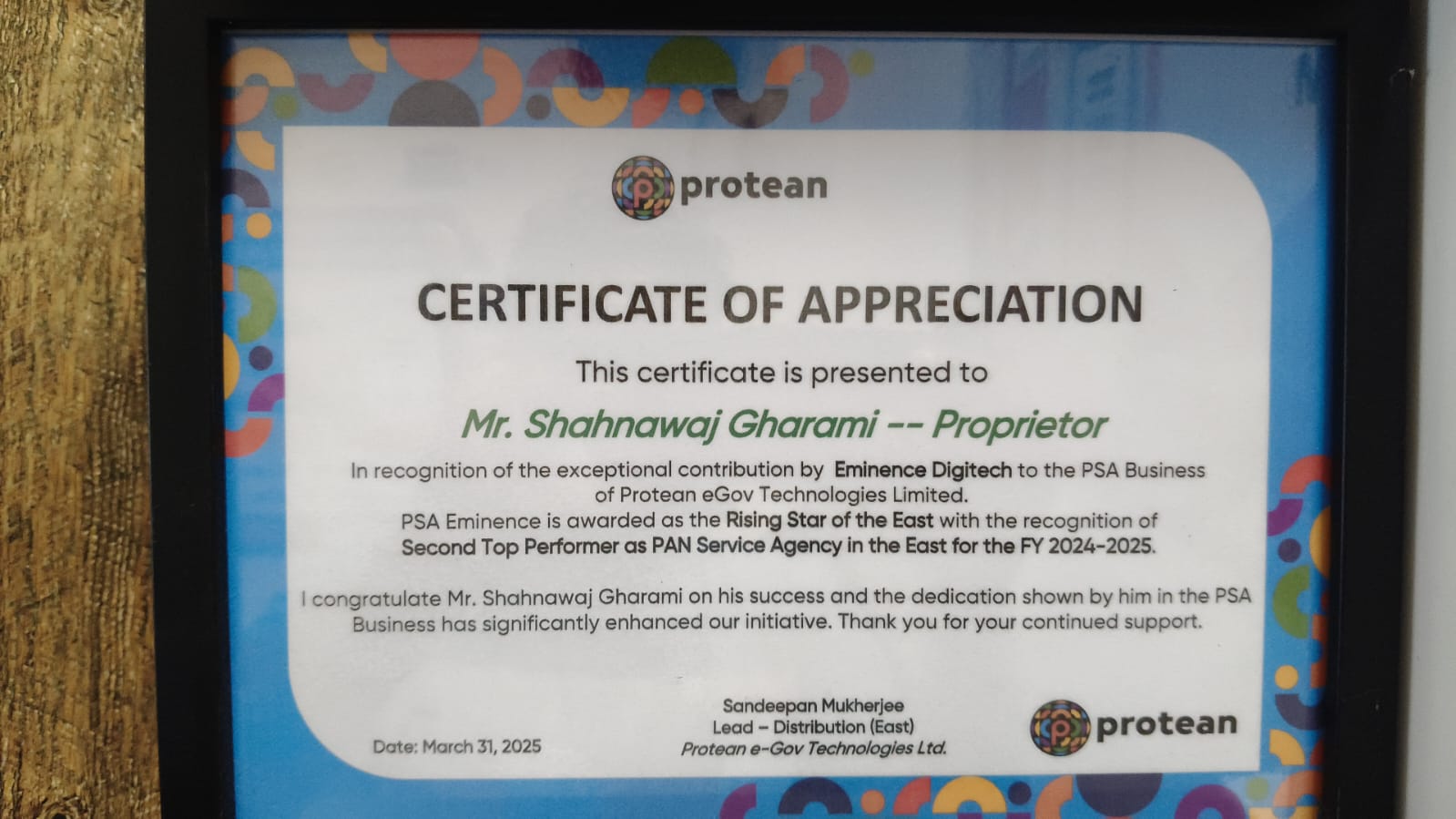 Recognized by Protean eGov Technologies Ltd. for exceptional contribution to the PSA business through Eminence Digitech. Honored as the โRising Star of the Eastโ and awarded Second Top Performer as PAN Service Agency in the East, reflecting outstanding performance, dedication, and consistent business growth.